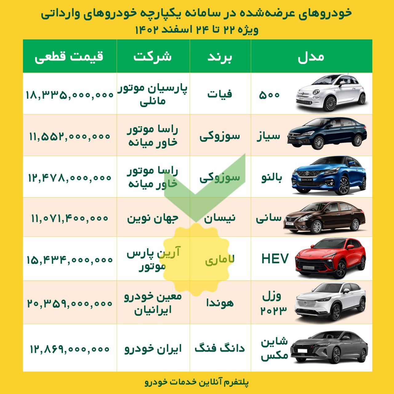 بنابر اطلاعیه منتشر شده در سامانه یکپارچه خودروهای وارداتی، دوازدهمین مرحله فروش ۹ خودروی جدید سامانه یکپارچه خودروهای وارداتی از برندهای نیسان، هوندا، تویوتا، فیات، لاماری، دانگ فنگ و سوزوکی از روز سهشنبه مورخ ۲۲ اسفند ماه ۱۴۰۲ لغایت پنجشنبه ۲۴ ام، ویژه متقاضیانی که در سال ۱۴۰۱ در سامانه ثبتنام کردهاند، برقرار است: