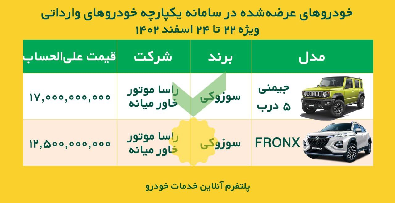 | ۱ | راسا موتور خاور میانه | Suzuki | Jimny 3 door | ۱۸.۰۰۰.۰۰۰.۰۰۰ |