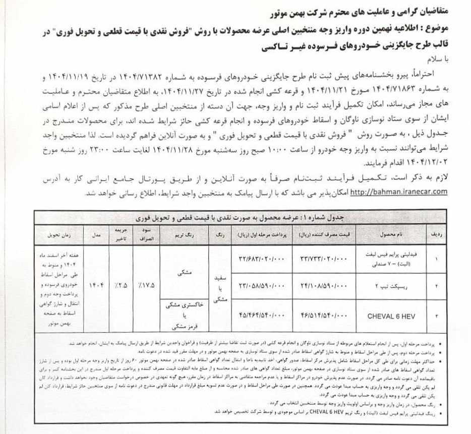 بخشنامه واریز وجه شوال ۶ بهمن موتور – بهمن ۱۴۰۴