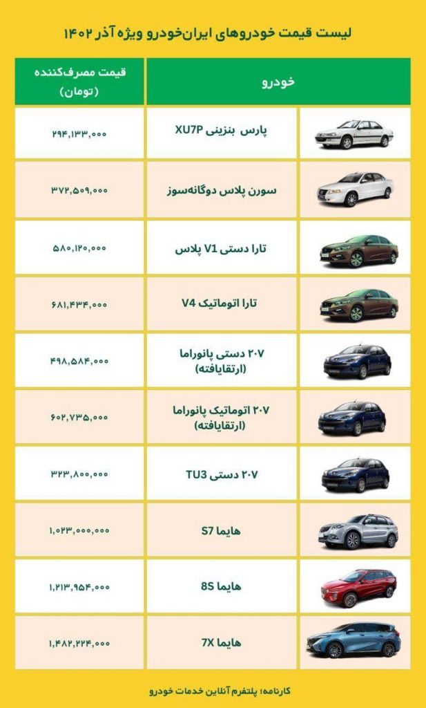 جدیدترین لیست قیمت کارخانهای محصولات ایران خودرو ویژه آذرماه ۱۴۰۲ اعلام شد. این قیمتها نهایی و برای مصرف کننده بوده و برای حوالههای و دعوتنامههای جدید اعمال خواهد شد: