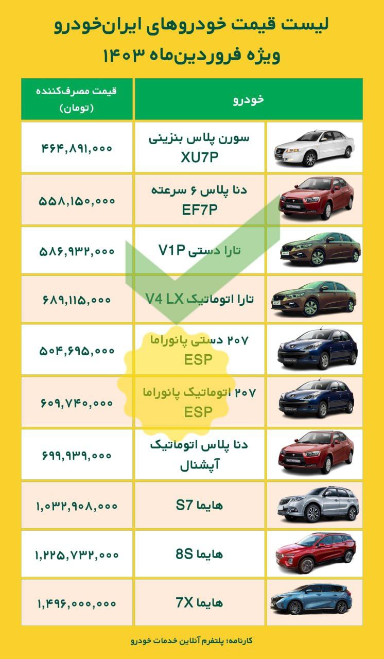 جدیدترین لیست قیمت کارخانهای محصولات ایران خودرو ویژه فروردینماه ۱۴۰۳ اعلام شد. این قیمتها نهایی و برای مصرف کننده بوده و برای حوالههای و دعوتنامههای جدید اعمال خواهد شد: