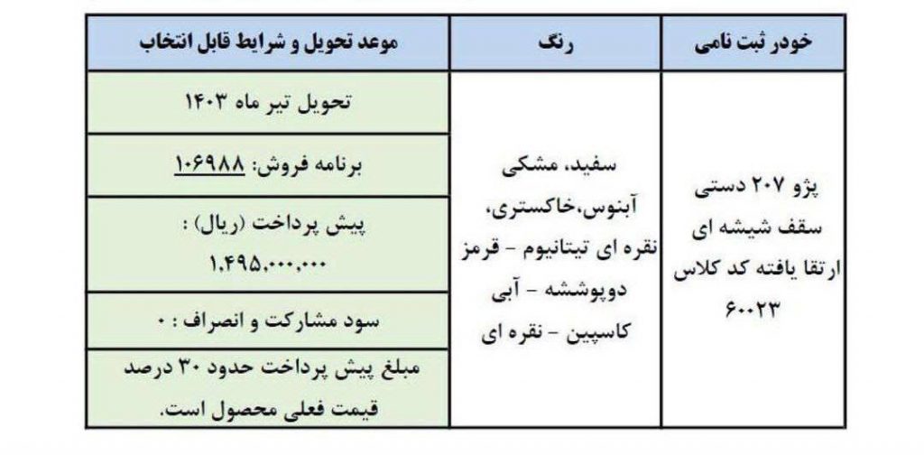 گروه صنعتی ایران خودرو در جدیدترین فراخوان ویژه برندگان سامانه یکپارچه، پژو ۲۰۷ دستی سقف شیشهای ارتقایافته را به صورت فروش فوق العاده و پیش فروش نقدی با موعد تحویل ۹۰ روزه و اردیبهشت ۱۴۰۳ عرضه میکند: