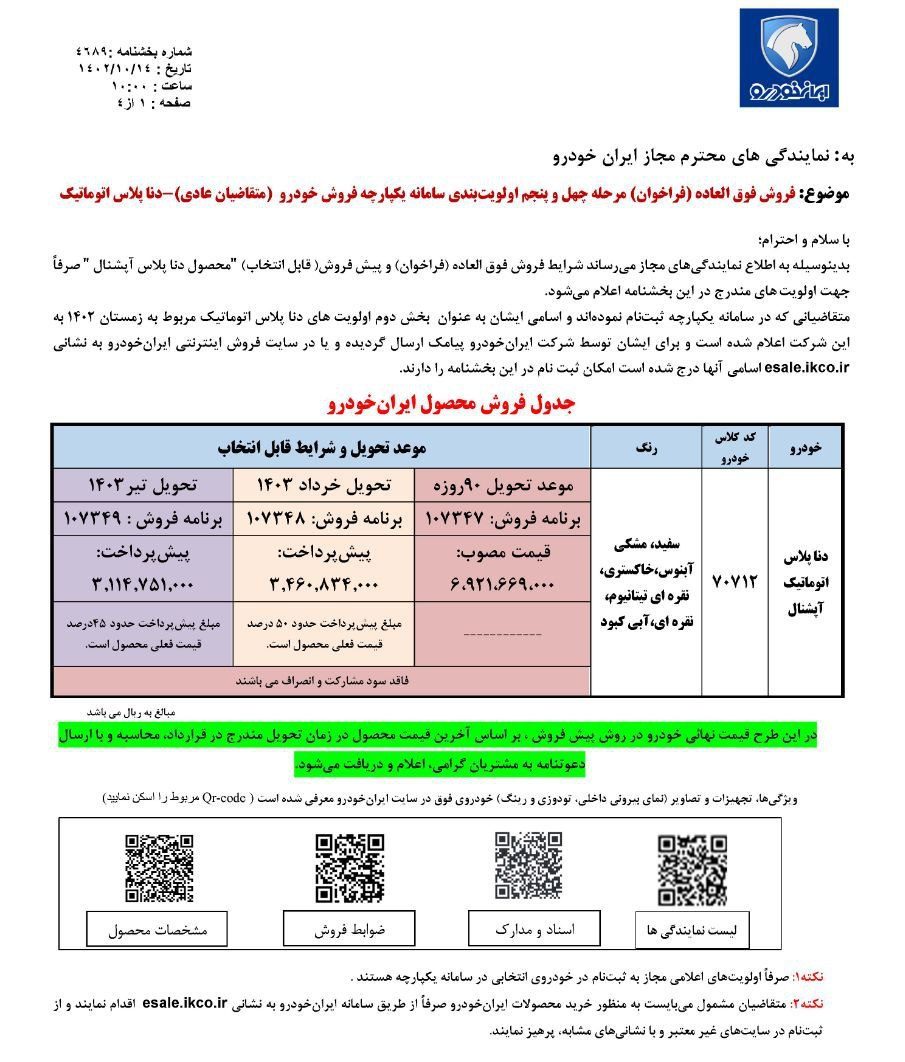 گروه صنعتی ایران خودرو در جدیدترین فراخوان ویژه برندگان سامانه یکپارچه، دنا پلاس اتوماتیک را به صورت فروش نقدی با موعد تحویل ۹۰ روزه و پیش فروش تحویل تیر و خرداد ۱۴۰۳ عرضه میکند: