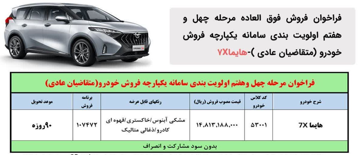 گروه صنعتی ایران خودرو در جدیدترین فراخوان ویژه برندگان طرح جوانی جمعیت سامانه یکپارچه، هایما ۷X را به صورت فروش نقدی با موعد تحویل ۹۰ روزه عرضه میکند: