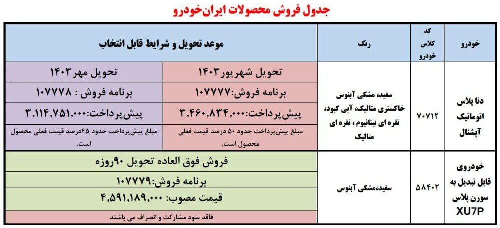 گروه صنعتی ایران خودرو در جدیدترین فراخوان ویژه برندگان سامانه یکپارچه، دنا پلاس اتوماتیک را به صورت پیش فروش تحویل شهریور و مهر ۱۴۰۳ عرضه میکند. متقاضیان میتوانند در صورت تمایل سورن XU7P را به صورت فروش ۹۰ روزه انتخاب کنند: