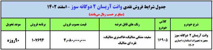 گروه صنعتی ایران خودرو در جدیدترین شرایط فروش اعلامی وانت آریسان ۲ دوگانه سوز را به صورت نقدی و با محدودیت عرضه میکند. آریسان ۲ در ۴ رنگ و با موعد تحویل حداکثر ۹۰ روزه به فروش میرسد. متقاضیان میتوانند از تاریخ پنجشنبه ۱۰ اسفند تا زمان تکمیل ظرفیت با مراجعه به سامانه فروش محصولات ایران خودرو به آدرس esale.ikco.ir نسبت به ثبت نام خودرو اقدام نمایند: