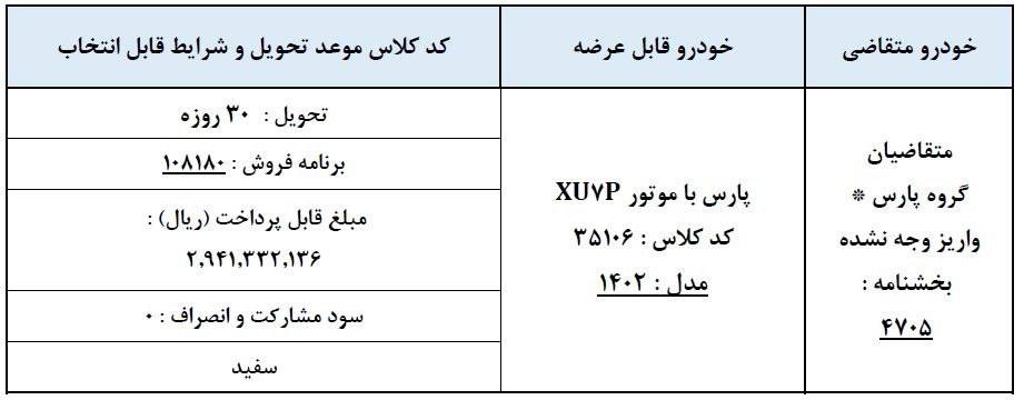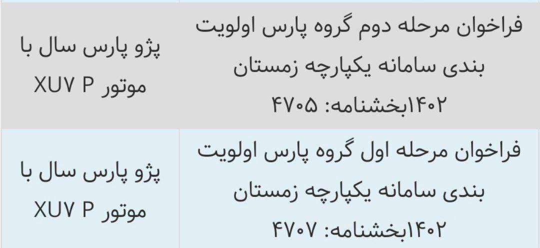 گروه صنعتی ایران خودرو در جدیدترین فراخوان ویژه برندگان سامانه یکپارچهبا اولویت پاییز و زمستان ۱۴۰۲، پژو پارس با موتور XU7P را در دو تیپ معمولی و ELX به صورت فروش نقدی با موعد تحویل ۹۰ روزه عرضه میکند: