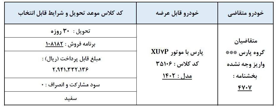 به اطلاع متقاضیان میرساند پیرو بخشنامههای ۴۵۸۱ و ۴۵۸۳، پیشفروش برخی از محصولات شرکت ایران خودرو ویژه متقاضیان عادی باقیمانده اولویتهای تابستان ۱۴۰۲ برای برخی از متقاضیانی که اخیراً معرفی شدهاند به شرح جدول ذیل اعلام میشود. لذا مشتریان واجد شرایط که پیامک فراخوان برای آنها ارسال میشود میتوانند بهمدت ۱۰ روز از تاریخ ۱۴۰۲/۰۳/۱۰ لغایت ۱۴۰۲/۰۳/۲۰ نسبت به واریز وجه اقدام کنند.